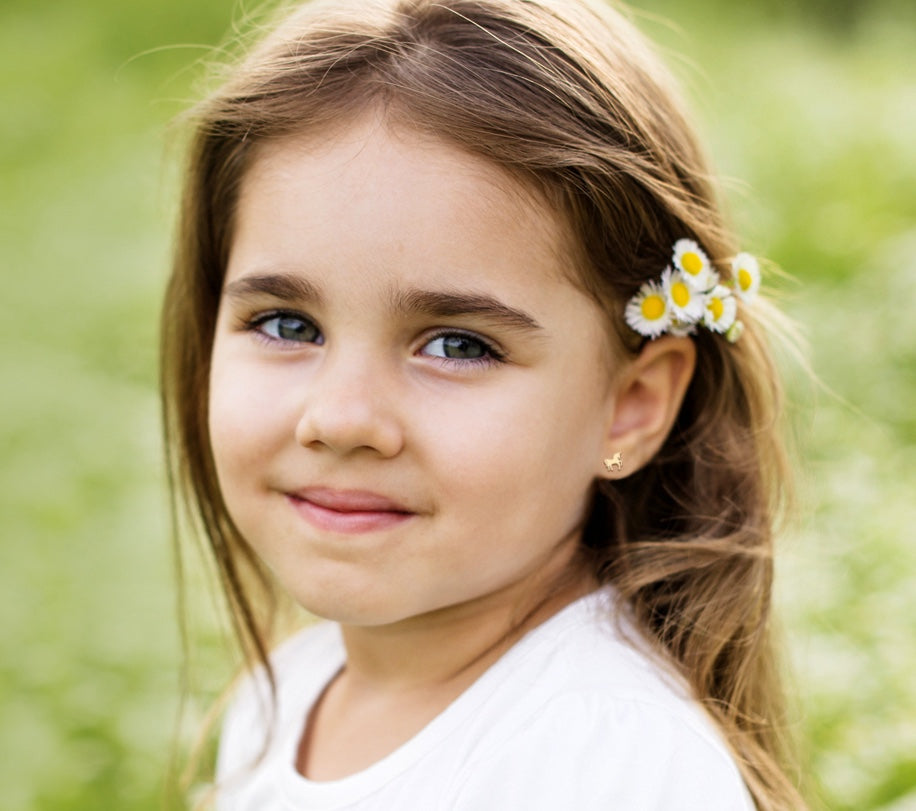 Enjoy the most beautiful smile when you look at your child, adorned with childrens gold earrings that add a touch of magic to her day.